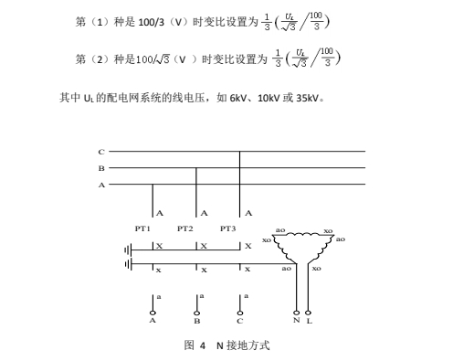 這種接線方式分“N 接地”、“B 相接地”兩種,分別如圖 4 和圖 5 所示。對于這兩種方式,均從 N-L 兩端注入測試信號。根據所用 PT 的不同,組成開口三角的二次繞組。