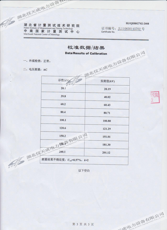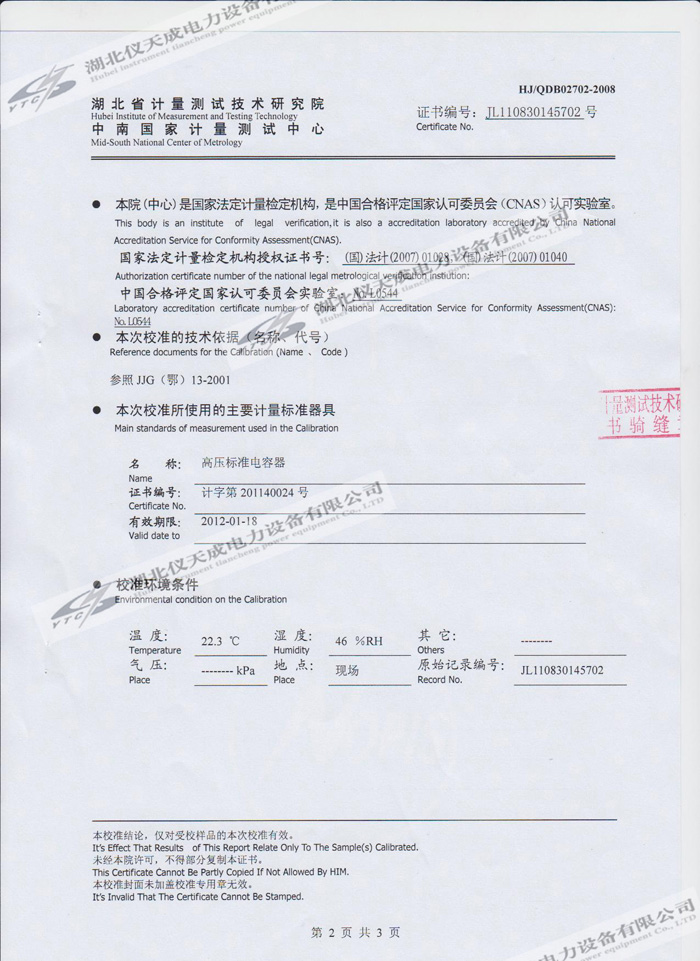 轉(zhuǎn)載:"YTC850-810kVA/270kV/45kV變頻串聯(lián)諧振試驗(yàn)裝置的資質(zhì)證書" 請注明來源于儀天成電力。  更多技術(shù)問題請致電儀天成電力客戶服務(wù):027-87876585,技術(shù)部專線:027-87876585,在線客服: 719388481